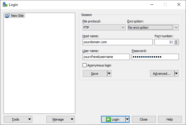 Setting Value File Protocol FTP Host name Your domain name (or temporary IP if DNS hasn’t propagated) Port number 21User name Your cPanel username Password Your cPanel password