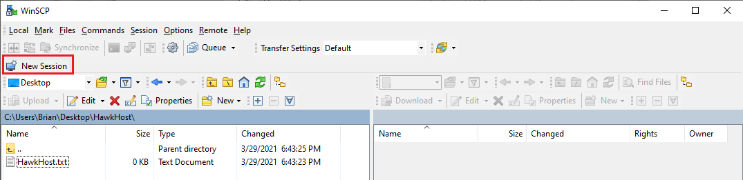 Install and open WinSCP, then click New Session in the top left.