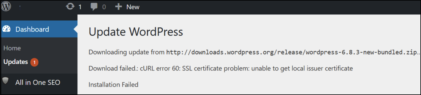 How to fix WordPress update error: Download failed. cURL error 60: SSL certificate